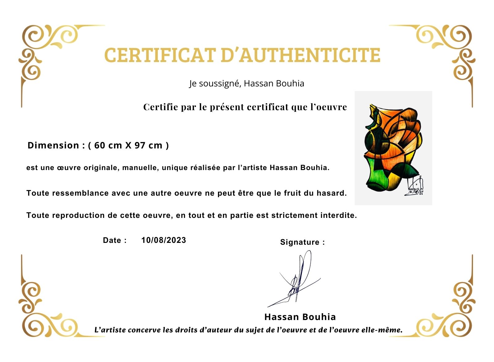 L’œuvre présente une composition énergique où les tons chauds dominent, renforçant une sensation de mouvement. Les nuances d’orange et de jaune contrastent avec le vert profond, créant un équilibre visuel dynamique. Les lignes noires marquent les formes avec force, donnant une structure presque architecturale au tableau. Il en résulte un effet de vitrail, où la lumière semble jouer à travers les couleurs. L’abstraction maîtrisée invite à une interprétation libre : certains y verront une fleur, d’autres une forme organique en pleine transformation. Les hachures et dégradés ajoutent du volume, suggérant un relief presque tactile. La juxtaposition des formes courbes et anguleuses renforce la sensation de tension et d’harmonie simultanées. L’œuvre semble capturer un instant figé dans le temps, une métamorphose en cours. La signature imposante de l’artiste affirme son style distinctif et reconnaissable. Une peinture vibrante qui interpelle et retient le regard.