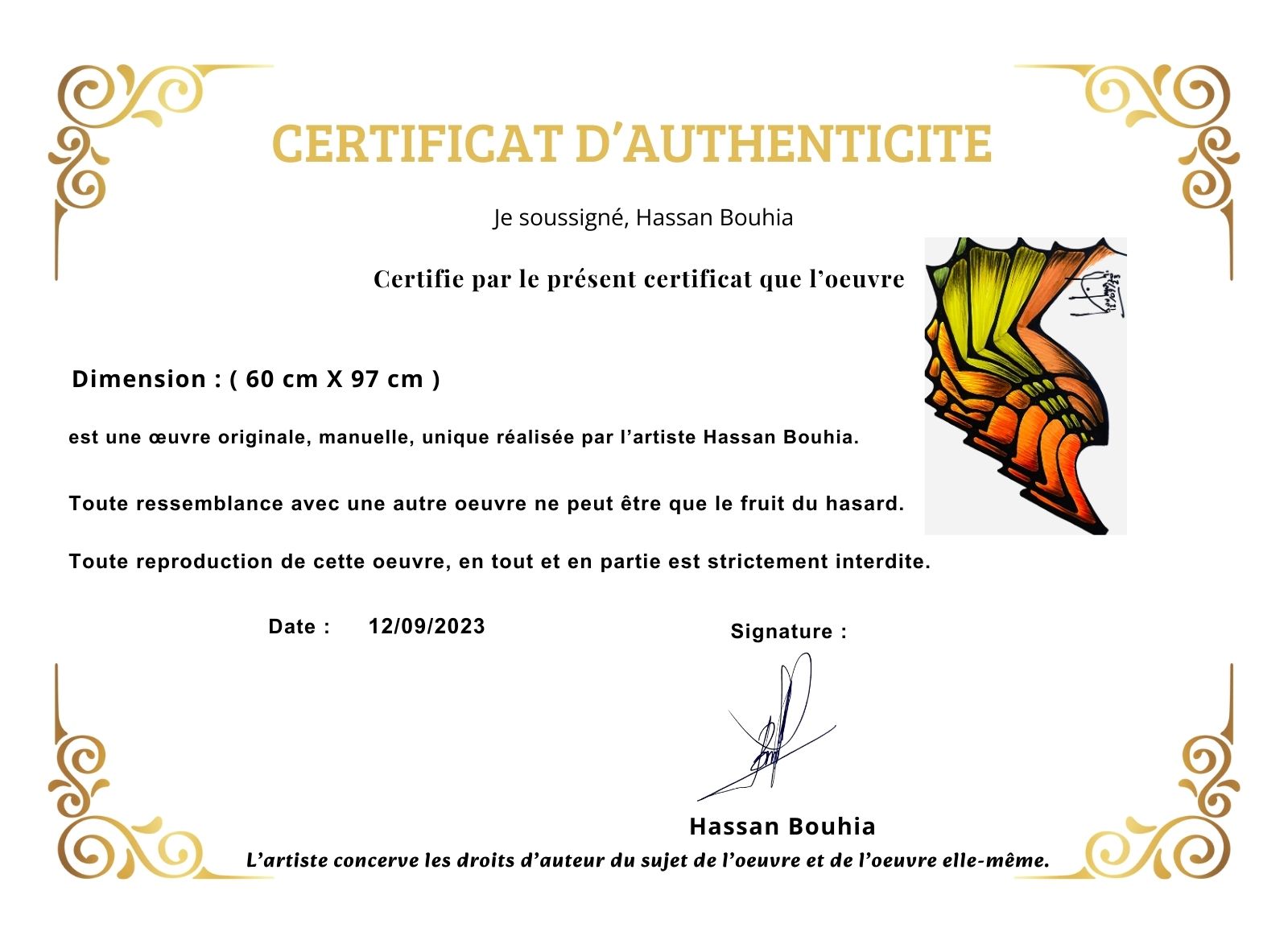 Cette composition aux contours acérés et aux couleurs vibrantes évoque une aile en pleine extension, figée dans un instant de transformation. Les teintes jaunes et orangées, rehaussées de touches brunes et vertes, rappellent les motifs naturels d’un papillon ou d’une feuille en mutation. Le jeu d’ombres et de lumières donne une impression de relief, renforcée par les lignes dynamiques qui semblent impulser un mouvement fluide. Chaque détail participe à un équilibre subtil entre structure et spontanéité, conférant à l’ensemble une puissance visuelle captivante. Une œuvre qui invite à la contemplation et à l’imaginaire