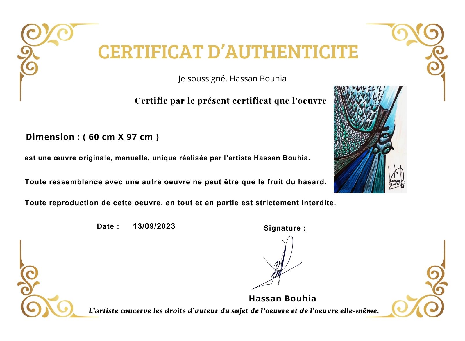 L'entrelacement de textures et de motifs dans cette composition crée un effet visuel fascinant, presque hypnotique. Les nuances de bleu et de vert, mêlées aux traits noirs affirmés, confèrent à l’ensemble une profondeur saisissante. L’utilisation de motifs évoquant des écailles et des symboles inscrits en surface donne une impression d’écriture ancienne ou de langage codé, ajoutant une dimension mystérieuse à l’œuvre. L’équilibre entre abstraction et structure est subtilement maîtrisé, guidant le regard à travers un jeu de contrastes et de reflets qui rappellent les jeux de lumière sur une surface aqueuse. Une invitation à la contemplation et à l’interprétation.