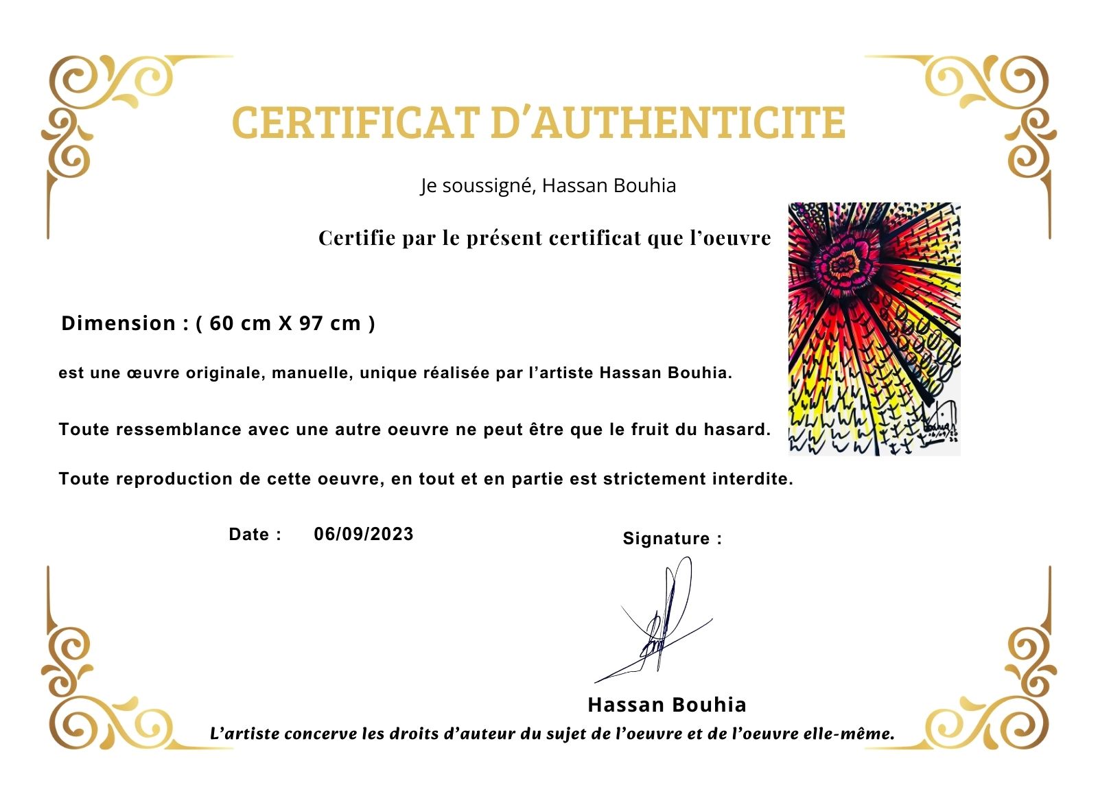Dans cette composition, l’artiste libère une explosion d’énergie à travers un centre vibrant qui semble rayonner vers l’extérieur. Les tons rouges, jaunes et noirs créent une intensité dramatique, renforcée par l’utilisation de motifs répétés qui donnent du rythme et de la profondeur. La structure radiale évoque une fleur en éclosion ou une explosion lumineuse, soulignant un mouvement dynamique. Les traits noirs marqués, presque calligraphiques, ajoutent une dimension graphique qui enrichit la composition. L’ensemble dégage une vitalité contagieuse, mêlant abstraction et symbolisme dans une œuvre visuellement captivante.