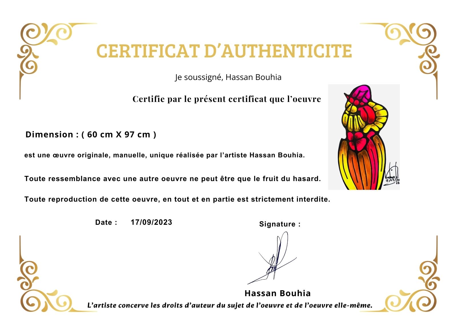 Cette œuvre vibre d’une énergie incandescente, où le jaune solaire et le rouge ardent contrastent avec les ombres profondes du noir. Les formes organiques s’entrelacent, donnant naissance à une figure qui oscille entre l’abstraction et l’évocation d’une créature mythologique. L’artiste joue avec la lumière et l’ombre, donnant du relief et du dynamisme à la composition. Les dégradés de couleurs, minutieusement travaillés, apportent une impression de mouvement et de transformation. On ressent une chaleur presque palpable, comme si l’image était traversée par une flamme intérieure. Le noir, omniprésent, agit comme un cadre structurant, mettant en valeur l’éclat des teintes vives. Cette tension entre l’obscurité et la lumière confère à l’œuvre une intensité dramatique fascinante. Chaque élément semble animé d’une pulsation, comme si le sujet était en pleine métamorphose. L’abstraction ne prive pas l’œuvre d’émotion ; au contraire, elle invite à une interprétation personnelle, où chacun peut y projeter son propre imaginaire. Une pièce vibrante et captivante qui témoigne du talent expressif de l’artiste.